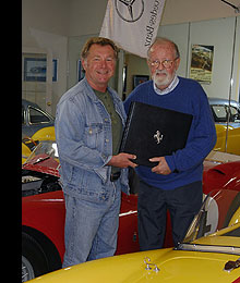 Here Russ Heinl (FerrariPhoto.ca) presents John with the first copy of his Ferrari Art Portfolio book, which he photographed and produced. At $2,000.00 each these portfolios are not for everyone but for those desiring their own personal art gallery collection of classic Ferrari photographs this portfolio will be of interest to them.